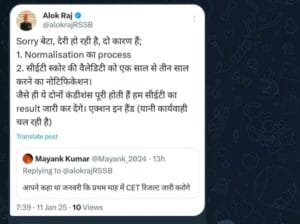 राजस्थान अधीनस्थ एवं मंत्रालयिक सेवा चयन बोर्ड (RSMSSB) द्वारा आयोजित CET (Common Eligibility Test) 12वीं लेवल का परिणाम जल्द ही घोषित किया जाएगा। लाखों उम्मीदवारों ने इस परीक्षा में भाग लिया है और अब सभी को बेसब्री से परिणाम का इंतजार है। इसको लेकर बोर्ड अध्यक्ष आलोक राज जी ने ट्वीट के माध्यम से जानकारी दी है।